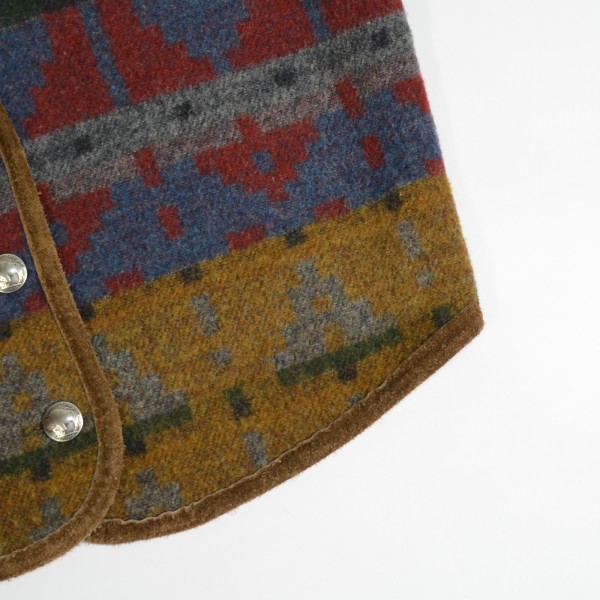 商品説明 アメリカで仕入れましたエルエルビーン社製のウールネイティブ柄ベストです。 ディティールはフロントにコンチョボタンを使用、ベストの端はスウェードのパイピング、 人気のネイティブ柄、うれしいUSA製の一枚です。 コンディションはスウェードのパイピングに使用感や毛羽立ち、 色がうすくなっている部分が見られます。 全体に着用感が見られます。 どれも着用には問題なく古着にご理解のある方なら、 気にならない程度のコンディションかと思います。 ■ ブランド : L.L.Bean ■ カラー : グレー/グリーン/レッド系 ■ コンディション : B ■ 素材 : 85% ウール、15% ナイロン ■ 生産国 : アメリカ ■ サイズ : 表記 Mサイズ (レディース) (下記実寸参照) ■ 実寸値 : 肩幅 38cm , 身幅 100cm , 着丈 48cm