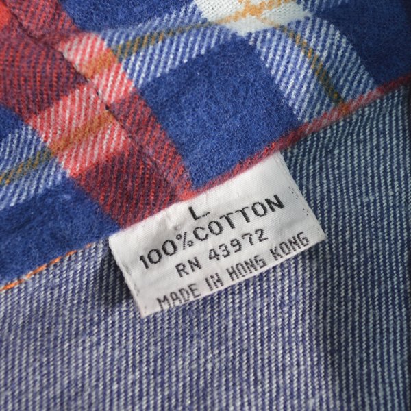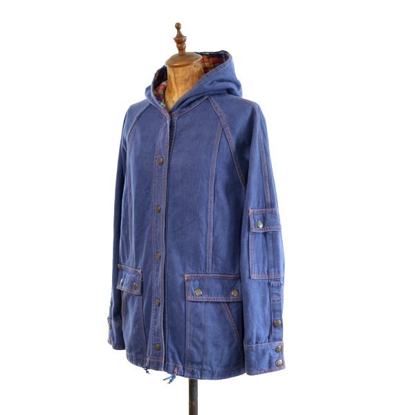 商品説明 アメリカで仕入れましたデニムフードジャケットです。 ボタンはすべてスナップボタン仕様。 フード裏や前立て裏、袖口裏などにチェックのフランネル素材が 貼られた良いデザインの一枚。 フロントがレディース合わせですが着用には問題ありません。 コンディションは全体に所々生地のムラ(生地不良)が見られます。 全体に着用感や色褪せが見られます。 着用には問題なく古着にご理解のある方なら、 許容範囲内のコンディションかと思います。 その他の詳しいコンディションは詳細画像にて記載しておりますので、 必ず詳細画像をご確認くださいますようお願いいたします。 ■ ブランド : Unknown ■ カラー : ネイビー系 ■ コンディション : C ■ 素材 : 100% コットン ■ 生産国 : 香港 ■ サイズ : 約 Mサイズ (表記 L レディース) (メンズ) (下記実寸参照) ■ 実寸値 : 身幅 108cm , 着丈 66.5cm , 裄丈 72cm