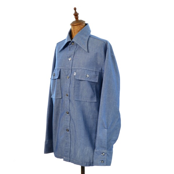 商品説明 アメリカで仕入れました70年代頃のリーバイス社製パナテラの シャツジャケットです。 左胸ポケット横にビッグEのタブ付き、大きな襟が特徴的な一枚。 コンディションは全体に着用感や所々にうす汚れが見られます。 どれも着用には問題なく古着やヴィンテージにご理解のある方なら 許容範囲内のコンディションかと思います。 その他の詳しいコンディションは詳細画像にて記載しておりますので、 必ず詳細画像をご確認くださいますようお願いいたします。 ■ ブランド : Levi's ■ カラー : ブルー ■ コンディション : C ■ 素材 : コットン、ポリエステル (表記なし) ■ 生産国 : 表記なし ■ サイズ : 表記 Mサイズ (メンズ) (下記実寸参照) ■ 実寸値 : 肩幅 46cm , 身幅 114cm , 着丈 75cm , 袖丈 63.5cm