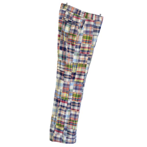 商品説明 アメリカで仕入れましたオールドのパッチワークパンツです。 フロントのジッパーはタロン社製、インド綿のマドラスチェック、 薄手のコットン素材の総裏張り、シルエットはほぼストレート。 コンディションは全体に着用感、所々に汚れや黄ばみ等見られます。 着用には問題なく古着にご理解のある方なら、許容範囲内の コンディションかと思いますが、汚れ等気になる方は電話または メールにてお問い合わせくださいますようお願いいたします。 その他の詳しいコンディションは詳細画像にて記載しておりますので、 必ず詳細画像をご確認くださいますようお願いいたします。 ■ ブランド : Unknown (タグに India Madras表記) ■ カラー : パッチワーク ■ コンディション : C ■ 素材 : 100% コットン ■ 生産国 : 表記なし ■ サイズ : 約 W31 (表記なし) (メンズ) (下記実寸参照) ■ 実寸値 : ウエスト 80cm , 股上 31cm , 股下 79cm , ワタリ 31cm , 裾幅 23.5cm
