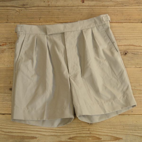 商品説明 90年代頃のイギリス軍のグルカショーツです。 フロントにタック入り、ウエスト両サイドにアジャスター付き、 ヒップポケットは片側のみ、さらっとした素材感。 コンディションは全体に着用感が見られます。 古着にご理解のある方なら、気にならない程度の コンディションかと思います。 その他の詳しいコンディションは詳細画像にて記載しておりますので、 必ず詳細画像をご確認くださいますようお願いいたします。 またその他のディティールやコンディションで不明な点はお手数ですが、 購入前に必ずメールにてお問い合わせをお願い致します。 ■ ブランド : British Army ■ カラー : ベージュ ■ コンディション : B ■ 素材 : 表記なし ■ 生産国 : イギリス (表記なし) ■ サイズ : 約 W32 (アジャスターを絞っていない状態) (メンズ) (下記実寸参照) ■ 実寸値 : ウエスト 81cm , 股上 31.5cm , 股下 13cm , ワタリ 32.5cm , 裾幅 27.5cm